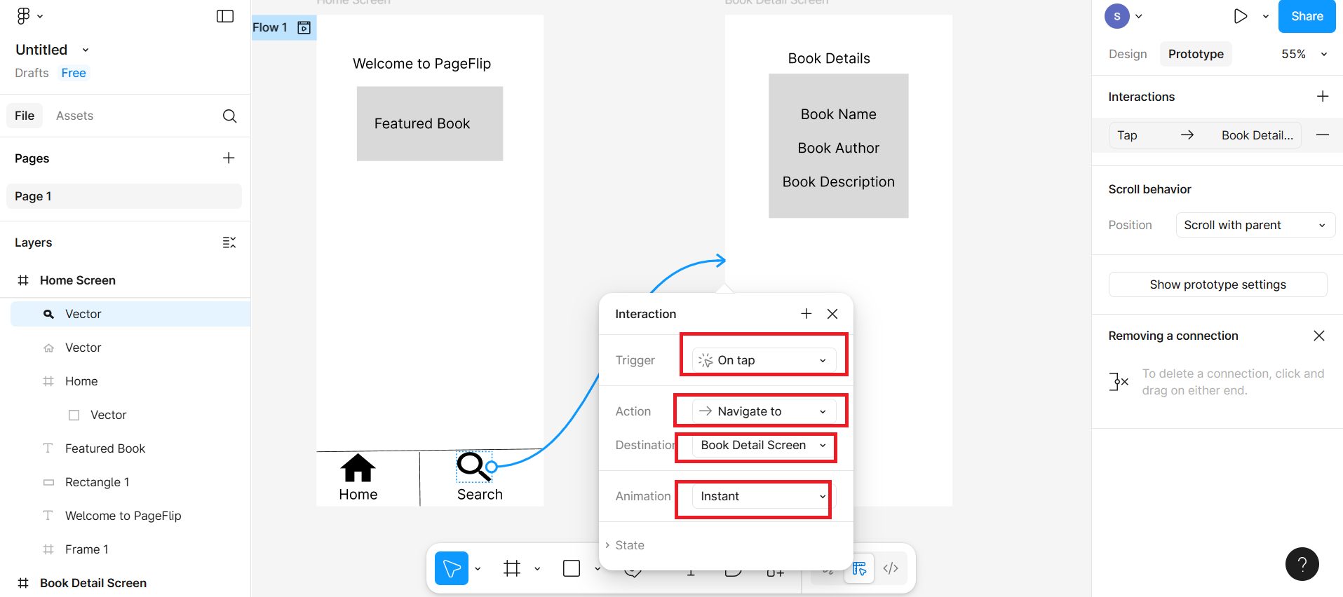Use the Prototype tab to link the new icon from the Home Screen to this new screen.